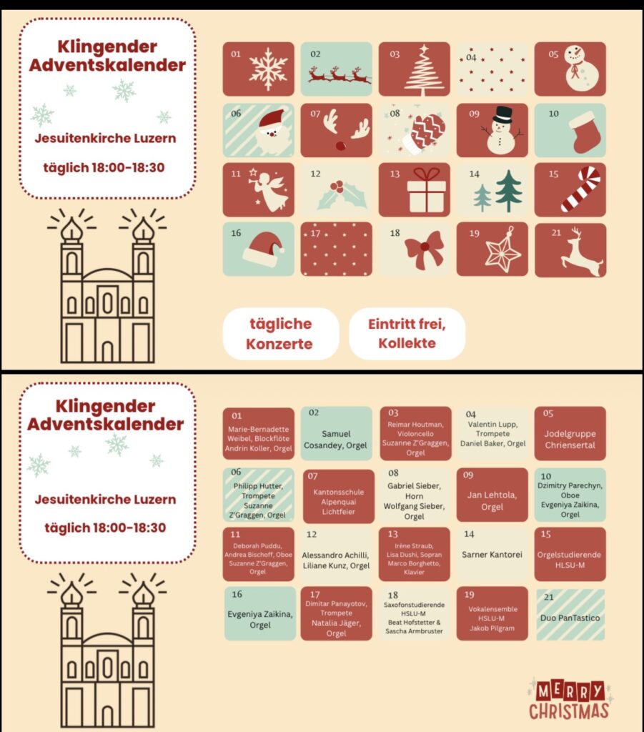 Vom 1. bis 21. Dezember 2025 erklangen in der Jesuitenkirche Luzern jeweils um 18:00 Uhr kurze Konzerte zur Adventszeit.